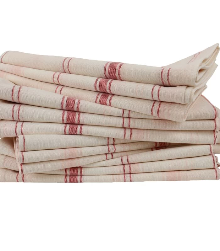 Het bezit van mooie theedoeken van natuurlijke vezels is zowel een nuttig als een praktisch gebaar, aangezien de kwaliteit superieur is aan die van synthetische theedoeken. Het is ook een accessoire dat een rustieke en authentieke toets geeft aan uw keuken. Wij hebben ervoor gekozen de Brasserie theedoeken te vervaardigen met een meerderheid van linnen draden, die absorberender zijn dan katoenen draden. Zodra de eerste wasbeurt gedaan is, zul je ontdekken hoe zacht en mollig ze zijn. En op ecologisch vlak heeft linnen in de landbouw geen irrigatie nodig, in tegenstelling tot de 10.000 liter water die nodig is om 1 kg katoen te produceren.   Kenmerken van de linnen en katoenen doeken BRASSERIE Verkrijgbaar per batch van 2, 3, 6, 12 in de kleuren blauw, oranje, rood, geel  Zachte touch vanaf de levering, dankzij de keuze van fijne vezels. Samenstelling : 52% linnen – 48% katoen Onderkant van de theedoeken in beige Afmeting : 55x81cm De halfbloed theedoeken worden gebruikt voor intensief gebruik, zowel in glaswerk als voor pannen. Restaurant professionals bestellen dit product bij ons. De dichte weving van 200gr/m2 verlengt de levensduur van de doek, was na was.   Hier is een set van 12 katoenen linnen theedoeken verkrijgbaar in blauw, oranje, rood en geel.    Onderhoud van de ongebleekt katoenen linnen theedoeken   Om ze zachter te maken, is het raadzaam ze vóór de eerste warme wasbeurt in koud water te laten weken. Daarna kunnen ze op 60°C worden gewassen en in de machine worden gedroogd.   Gemaakt in de EU Oeko Tex standaard Â