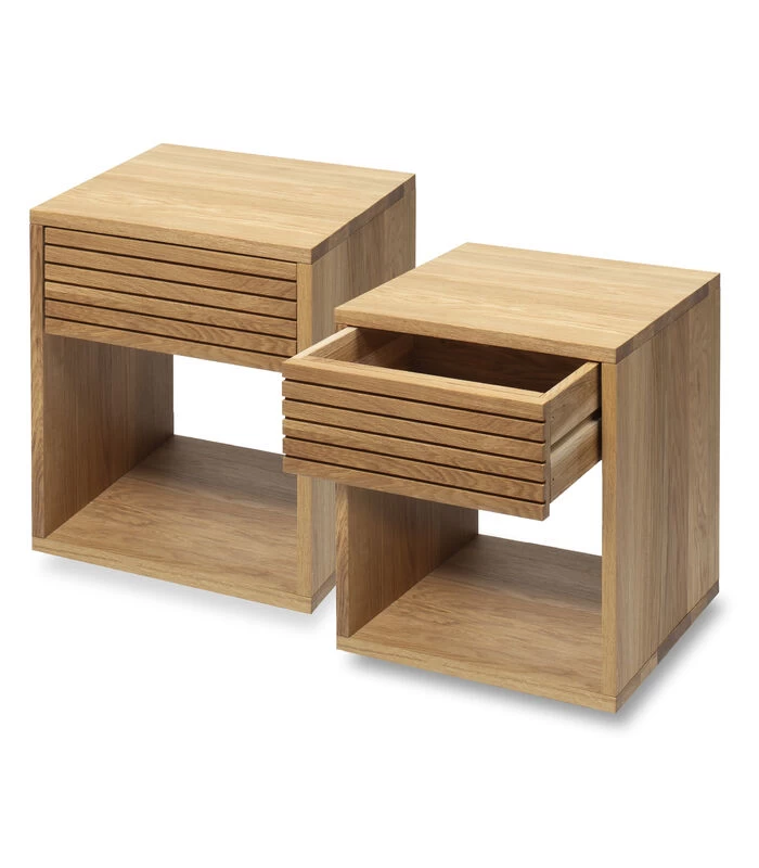 Het nachtkastje, dat de natuurlijke schoonheid van Europees eikenhout benadrukt, combineert de Scandinavische stijl met moderne superieure kwaliteit. Ontworpen met een enkele lade en een onderste plank, heeft dit meubel een houtstrook effect detaillering op het voorpaneel wat een verfijnd stijlaccent geeft. Dit product is gemaakt van natuurlijk massief eikenhout, elk stuk is uniek qua kleur, natuurlijke kenmerken, nerfpatronen en afwerking. Het is dus mogelijk dat u enkele verschillen tussen artikelen van eenzelfde productlijn ziet; dit is onderdeel van de natuurlijke schoonheid van onze producten.