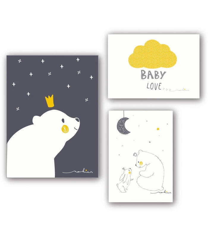 Posters uit de collectie Gaby & Sam. Schattige decoratie voor de babykamer. Set met een poster van 30 x 40 cm en twee posters van 21 x 30 cm. De posters passen in kaders met standaardafmetingen.