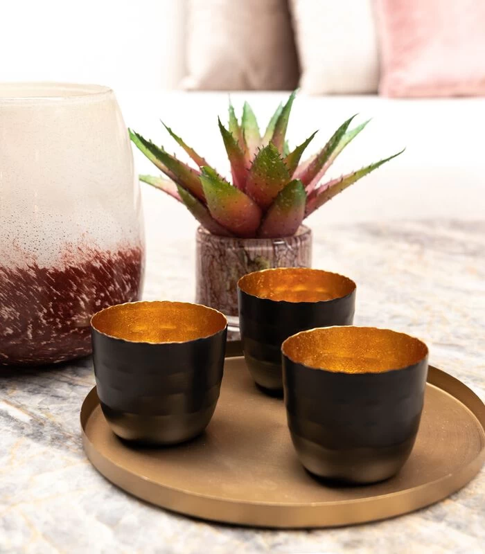 De set van 3 theelichthouders Arras mag niet ontbreken in je interieur. De 3 kommetjes zijn stoer én elegant. De binnenzijde lijkt wel van bladgoud en contrasteert mooi met de pikzwarte buitenkant. Dit trio kan je overal een plaatsje geven. En nog eens… en nog eens… Zoekwoorden : Kaarshouder, Zwart,