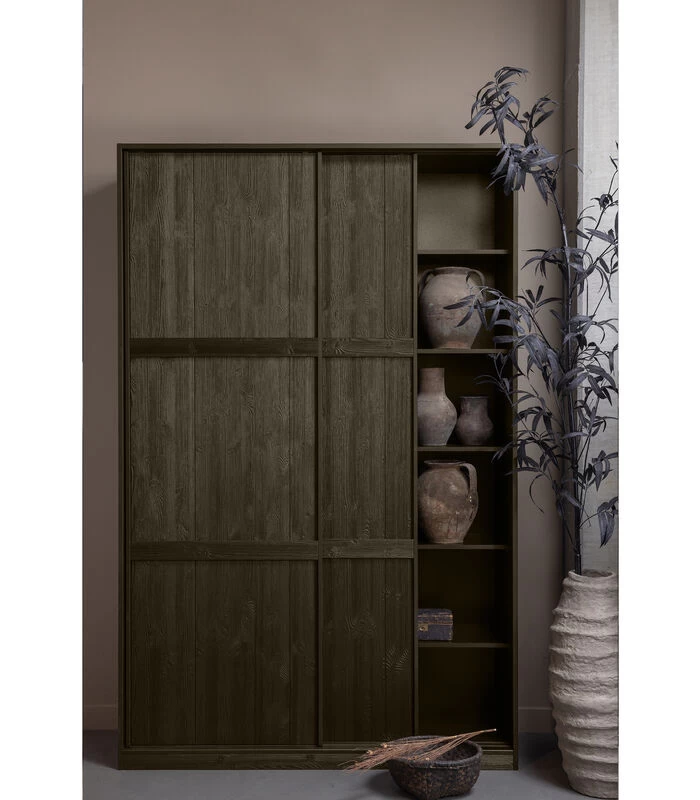 Het item is vervaardigd uit diep geborsteld grenenhout. De grenenhouten meubelen uit onze collecties zijn FSC–gecertificeerd en worden op diverse manieren behandeld. Zo is geschuurd grenen zeer glad en netjes en staat geborsteld grenen juist bekend om zijn karakteristieke nerftekeningen en doorleefde uitstraling. Voor een nog robuustere look wordt het grenenhout band gezaagd. Grenenhout wordt gekenmerkt door een lichtgele kleur en zichtbare vlamtekeningen. De zwarte legplanken buiten het zicht zijn gemaakt van spaanplaat (fsc) en de zwarte achterwand is gevormd uit HDF (fsc).