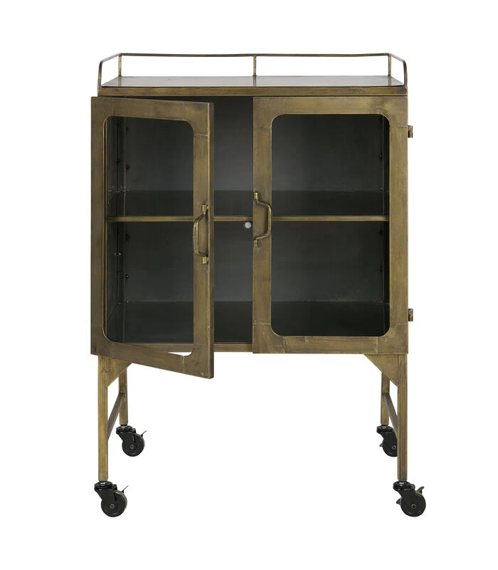 Uniek en origineel, een kleinere variant vitrinekast op wielen! Deze Talent vitrinekast staat op wielen, wat er voor zorgt dat je de kast makkelijk kunt verplaatsen. Dat geeft Talent ook net die verrassende touch. Je kunt de wielen ook blokkeren, dan kom je niet voor verrassingen te staan. Het kastje beschikt over een plank in het midden, zodat je twee verschillende niveaus hebt om je spullen tentoon te stellen en wordt afgesloten door middel van twee deurtjes met glas erin. Talent is gemaakt van metaal en afgewerkt in de kleur antique brass. Jouw persoonlijke schatten komen echt tot recht in deze eyecatcher.