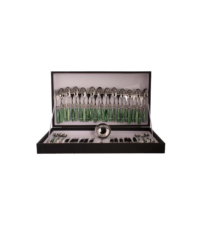 Deze EME Mona Lisa bestekset is ontwikkeld voor de liefhebber van bestek van Italiaanse hoogwaardige kwaliteit en een eigentijdse afwerking. Traditioneel en modern is in deze bestekset samen gebracht, waarbij het bestek licht in gewicht is. Deze serie kenmerkt zich door een uitstekende balans in dikte van het handvat en het lange, elegante lemmet. Deze prachtige 49–delige bestekset bestaat uit 12 tafelvorken, 12 tafelmessen, 12 tafellepels, 12 koffielepels en 1 soep/opscheplepel. Ieder item is gemaakt 18/10 roestvrij staal en heeft een acryl groen handvat.