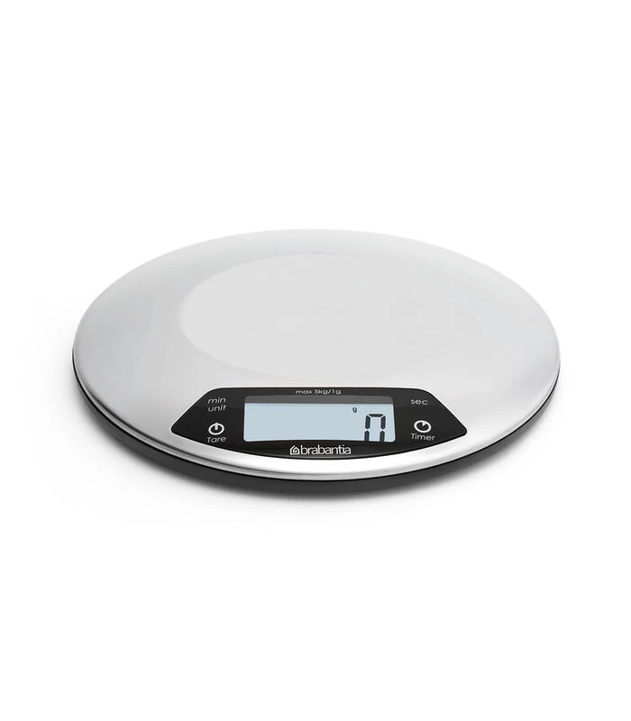 Je kookkunsten opschalen? Hoog tijd voor deze ronde, digitale Brabantia Profile Keukenweegschaal met kookwekker. Een strakke roestvrijstalen weegschaal met een geïntegreerde kookwekker met alarm om je te waarschuwen wanneer je taart klaar is. Deze allrounder heeft een verlicht display, auto–off en weegt alles, van 1 gram tot 5 kilo. Een knap staaltje weegschaal!