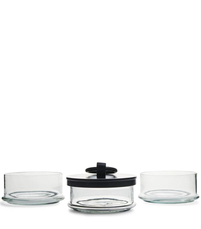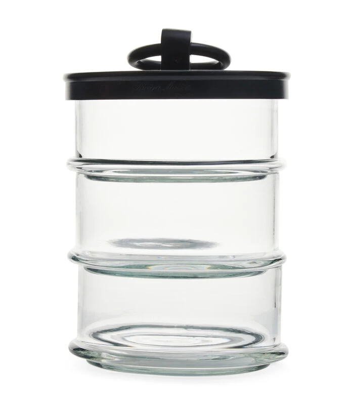 De ‘Cordoba’ voorraadpot is een handige opberger met drie glazen compartimenten. Zo kun je veel kwijt en zien wat je opbergt, zonder dat het teveel ruimte kost. De pot is gemaakt van mondgeblazen glas met een deksel van zwart aluminium, wat voor een strakke touch zorgt. Verkrijgbaar in verschillende uitvoeringen en maten.