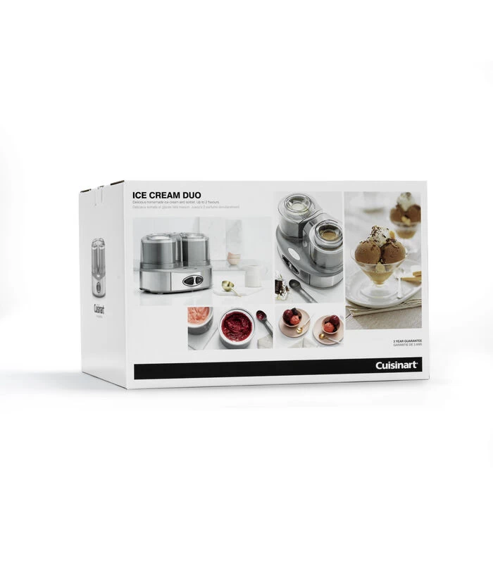 Het is nu eenvoudiger dan ooit om zelf ijsdesserts klaar te maken met de Cuisinart Ice Cream Duo ijsmachine. Maak tot 2 x 1 l heerlijke sorbets, ijs of frozen yoghurt met verse ingrediënten naar keuze. Je kunt 2 verschillende smaken tegelijkertijd maken en verschillende ingrediënten toevoegen tijdens de bereiding.