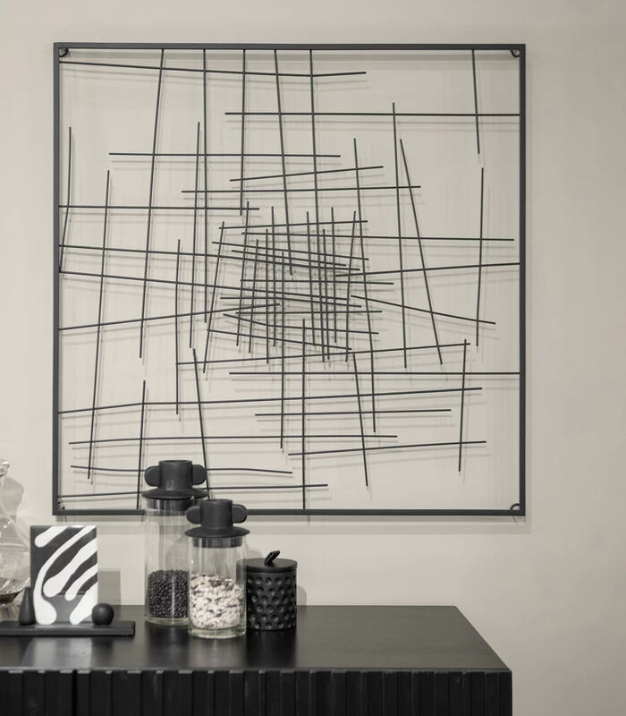 Tover die kale wand om tot een ware blikvanger met deze opvallende Fidde wanddecoratie. Dit abstracte object komt uit de collectie van het Nederlandse merk WOOOD Exclusive en heeft een formaat van 80×80 cm. Het zwart metalen frame heeft een dikte van 3 cm. Door middel van de vier bevestigingsringen is de wanddecoratie eenvoudig op te hangen. De bevestigingsringen zijn aan het frame gelast en hebben een formaat van een kleine centimeter. Dit item wordt exclusief bevestigingsmateriaal geleverd. Fidde heeft een gewicht van 3,5 kg.