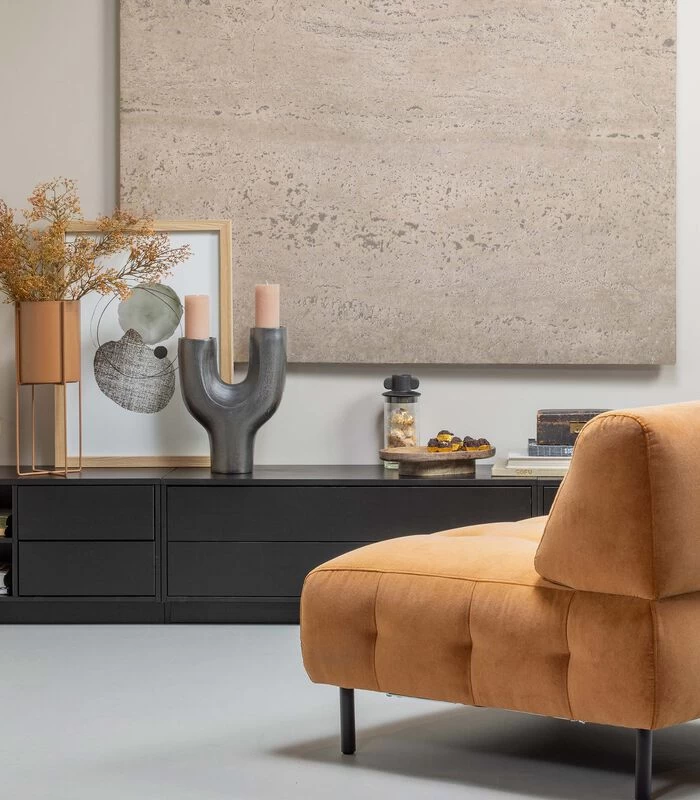 Het Finca tv meubel met rond element is een waar pronkstuk in de woonruimte. De open vakken bieden genoeg ruimte voor het presenteren van jouw mooiste woondecoratie. De twee laden houden nog eens een ruime opbergruimte uit het zicht. De onderrand van het tv meubel laat 7 cm ruimte over aan de voorzijde, hierdoor lijkt het meubel te zweven.