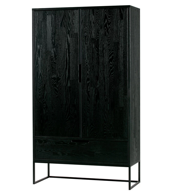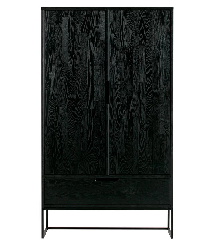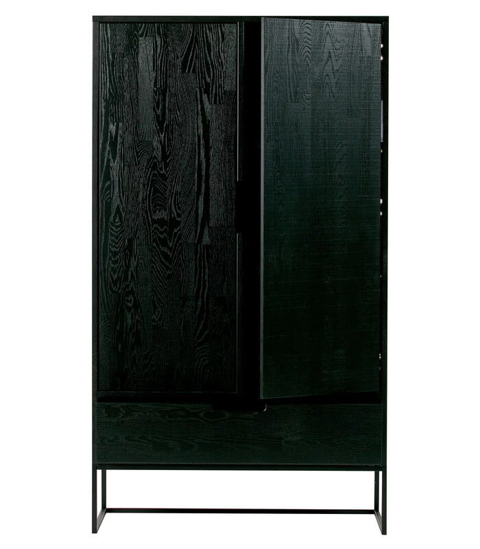 WOOOD Exclusive Silas 2–deurs kast – Essen – Blacknight– 85x149x35,5 cm (bxhxd) De WOOOD Silas 2–deurs kast [FSC] heeft een moderne uitstraling en biedt een stijlvolle plaats om je spullen in op te bergen. De Silas 2–deurs kast is gemaakt van massief essen met een geborstelde afwerking dat is afgelakt in de kleur blacknight. Het onderstel (h: 20 cm) is gemaakt van metaal en is afgewerkt in een zwarte kleur. De Silas 2–deurs kast heeft een hoogte van 149 cm, een breedte van 85 cm en een diepte van 35.5 cm. De grote lade onderin heeft een diepte van 31 cm en een hoogte van 13 cm. De kast heeft 2 deuren, waar achter zich 2 legplanken over de breedte van de kast bevinden en het tussenschot heeft een inkeping zodat je de deuren kunt openen. Artikelkenmerken