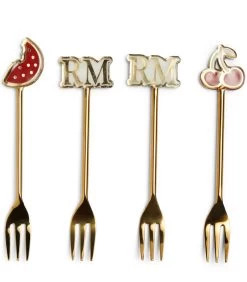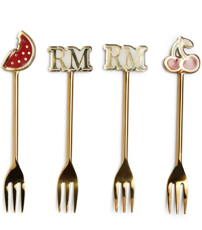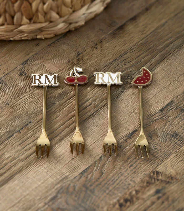 Maak je op voor de zomer met deze set van vier gebaksvorkjes. De goudkleurige vorkjes hebben allemaal een emaillen figuur op het uiteinde van de steel. Zo prik je een puntje mee met de initialen van Rivièra Maison, twee kersen of een schijfje meloen. Met welke reden snijd jij de taart aan?