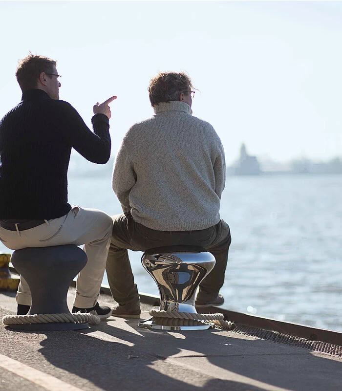 Ahoy, zeevarenden en landrotten, waterratten en cruisefans. Het merk PHILIPPI komen uit Hamburg en deze eenvoudige, maar buitengewone kruk is een speciaal eerbetoon aan onze geboortestad – aan onze stad – de “poort naar de wereld”! Onze HAMBURGER HOCKER (“hocker” is het Duitse woord voor krukje), is een replica van een meerpaal waar schepen aan vastgemaakt worden. Zoals in havens over de hele wereld, of op de landingsbruggen van onze Hanzestad, de “Landungsbrücken”, staat de HAMBURGER HOCKER voor veel dingen: het is een teken van vertrek, terugkeer, nieuwsgierigheid, maar ook een symbool voor aankomst, blijven en bewust pauzeren. Hij heeft rust gevonden in zichzelf en is zo rotsvast als een rots. In een notendop: Overal waar een HAMBURGER HOCKER te vinden is, daar vinden we een stukje thuis.