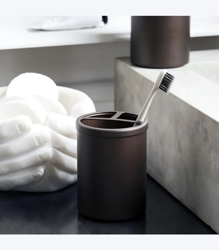 Gebruik deze aluminium beker om uw badkamer een modern tintje te geven zonder de bank te breken. Bush is ontworpen door House Doctor en wordt geleverd in een matte bruine kleur die een tijdloos en toch modern tintje geeft aan uw badkamerinrichting. Gebruik het om uw tandenborstels in op te bergen en plaats ze in de twee kleinere compartimenten, terwijl het grotere compartiment uw tandpasta bevat. Om hem te wassen, verwijder je gewoon het deksel. Combineer hem met de zeepdispenser met hetzelfde design voor een harmonieuze uitstraling naast uw wastafel.