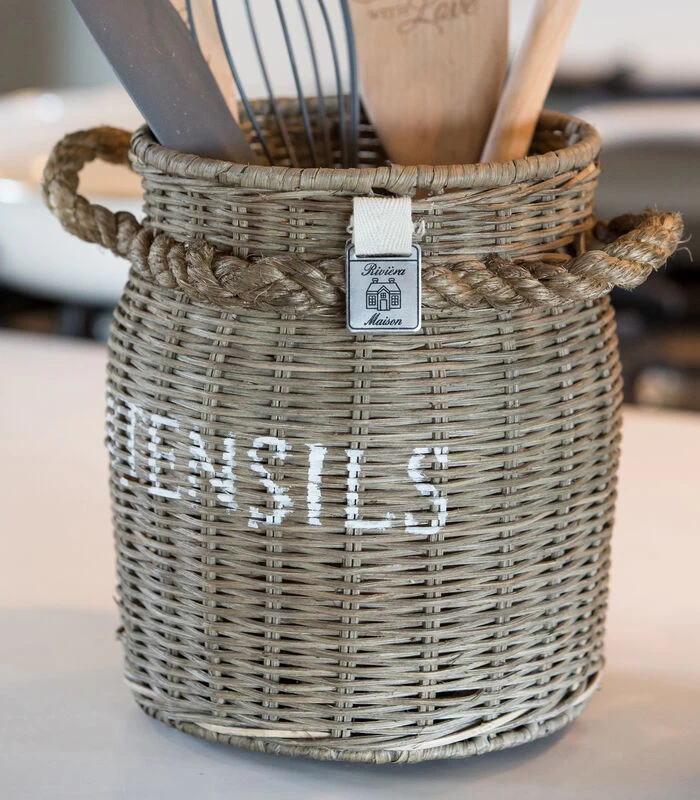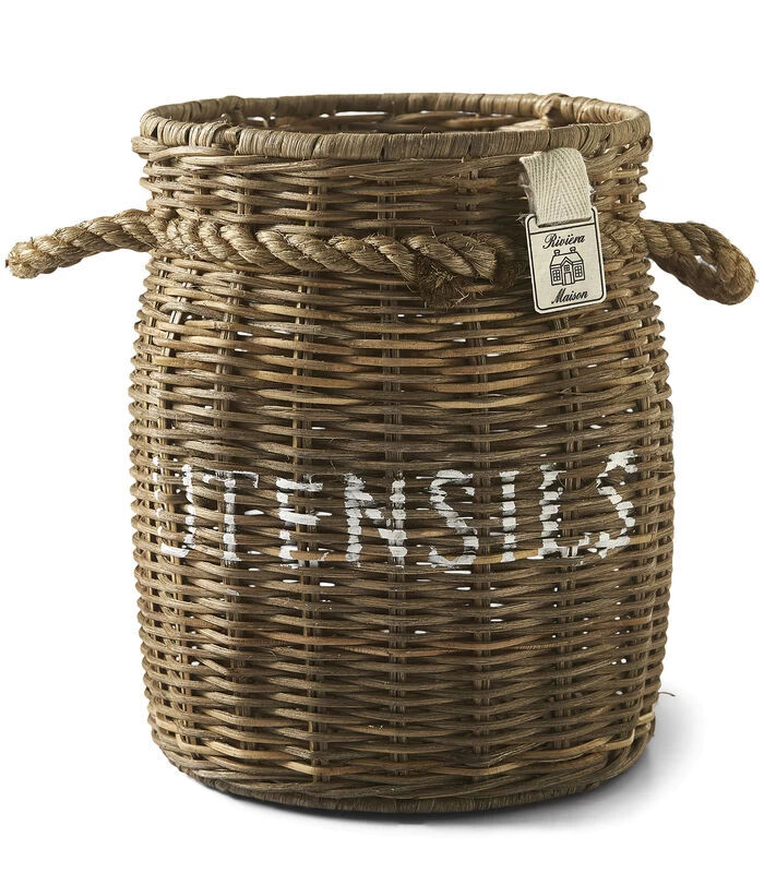 Deze mand is gemaakt van rotan waardoor hij een landelijke uitstraling heeft. Aan de zijkant heeft hij praktische greepjes van touw, waardoor u hem makkelijk kunt verplaatsen. De mand is met de hand gevlochten en het woord ‘utensils’ is er met de hand op geschilderd, echt vakwerk. Handig voor in de keuken voor het opbergen van al uw keukengerei.