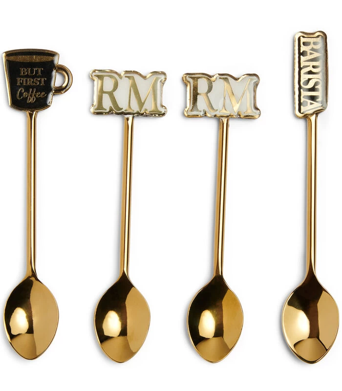 Of je nu een echte barista bent of gewoon een koffie– of theeleut, een mooie set kleine lepeltjes mag in je bestekcollectie niet ontbreken. De Coffee & Tea Barista lepels is een set bestaande uit vier kleine koffie– of theelepels van goudkleurig metaal. De lepels zijn versierd met een koffiekopje, het woord barista of het RM–logo.
