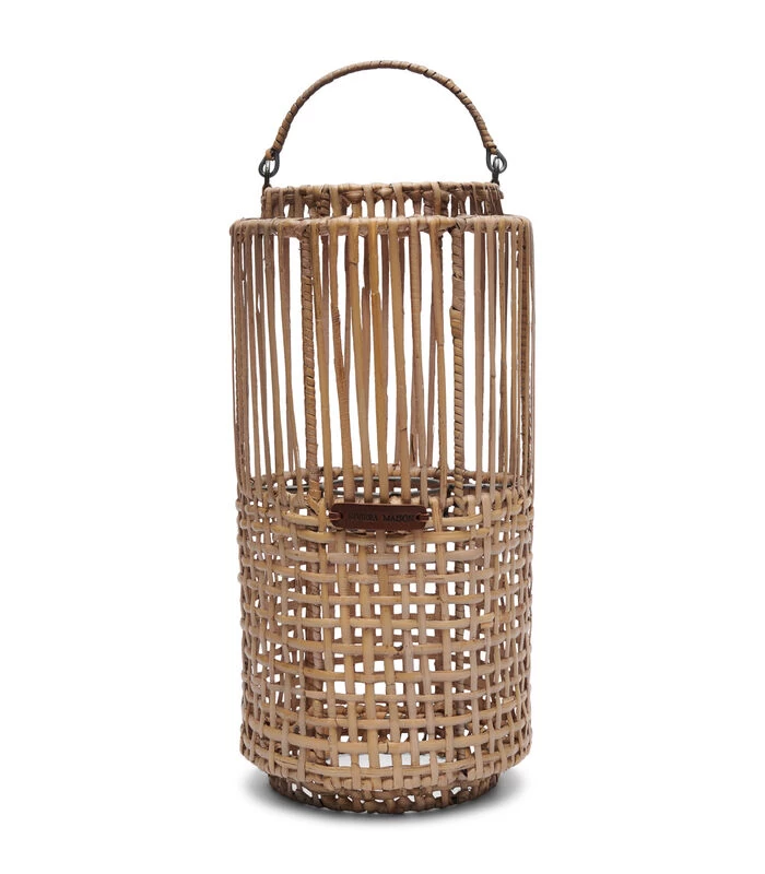 Wat een prachtig gevlochten handwerk, deze Rustic Rattan Webbing Lantern. De ambachtslieden die zich hiermee bezighouden, weten wat ze doen. Verticale en geruite patronen rondom en een stevig hengsel om de lantaarn te verplaatsen. Zet er een mooie grote stompkaars in.