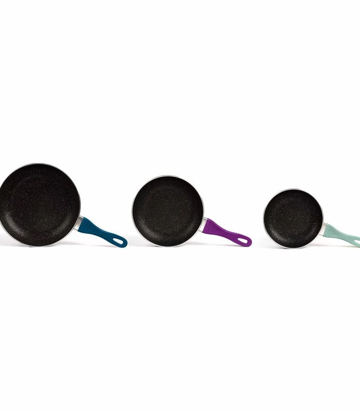 Set van 3 aluminium braadpannen. Antiaanbakcoating. Kwaliteit ILAG®. Steenmotief. Diameter 20, 24, 28 cm. Zachte–touch siliconen gecoate handgreep. Compatibel met inductie warmte. Koken zonder vet.