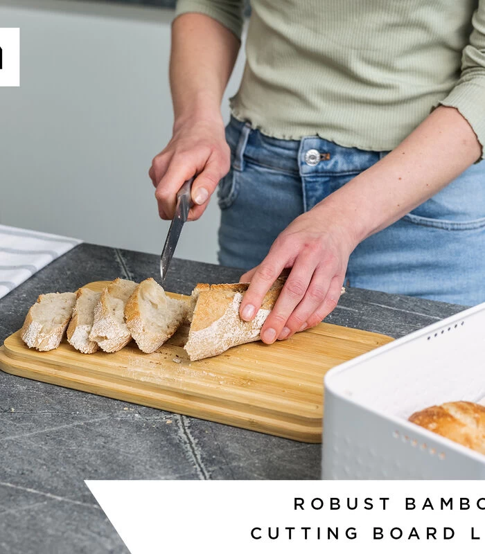 De extra stevige bamboe deksel zorgt voor optimale bewaarcondities en is tevens geschikt als hoogwaardige broodsnijplank. De opbergdoos biedt voldoende ruimte voor meerdere stukken brood en gebak.