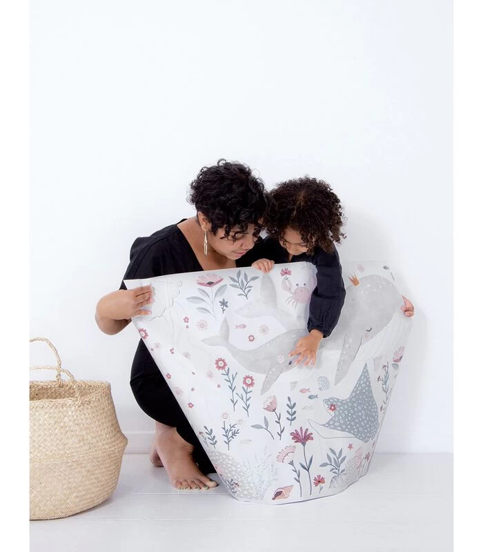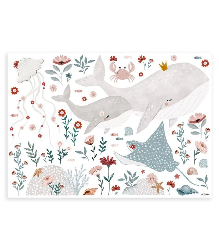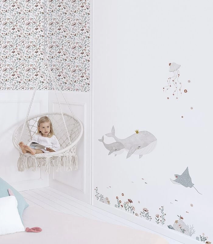 Een prachtig thema in de baby– en kinderkamer met de mooie walvissen, manta’s, krabbetjes, schildpadden, bloemen en koraal. Voor een uniek kamertje in zachte natuurlijke tinten!Â