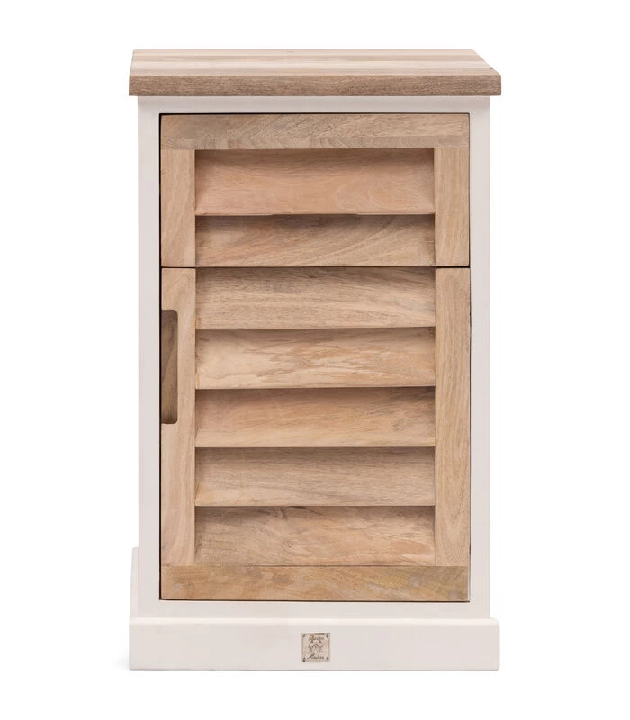 Neem de Pacifica–serie mee de slaapkamer in met dit nachtkastje uit deze luchtig ogende serie. De meubelen uit deze collectie zijn allemaal gemaakt van mangohout in naturel en met een witte coating. Opvallend is de ‘shutter–look’ die in dit nachtkastje is verwerkt in een lade en deurtje met lamellen. Verkrijgbaar in een linker– en een rechtervariant.