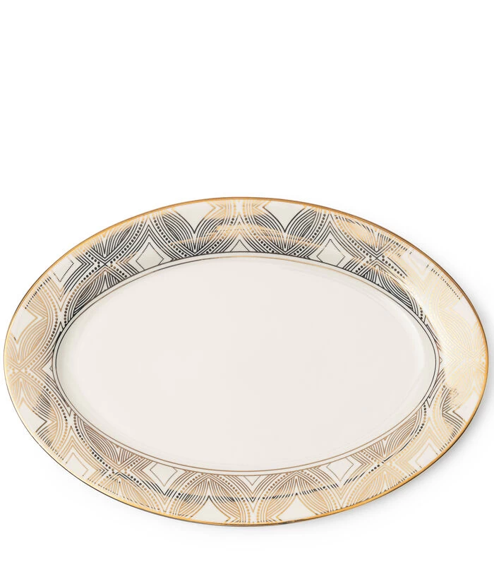 Le Relais Oval Plate, om tijdens de maaltijd een gerecht op te serveren. De ovale schaal hoort thuis in het Le Relais servies en glaswerk. Natuurlijk kan de schaal ook worden gebruikt om tijdens het borreluur de hapjes op door te geven. De schaal heeft een gouden bies met strepen en stippels.