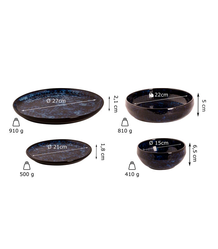 Glanzend tot in de perfectie en rijkelijk gedecoreerd. Bama Blue van Palmer heeft een prachtige diep blauwe kleur. Dit opvallende steengoed is met recht betoverd te noemen. Deze complete 24–delige serviesset schalen is gemaakt van het materiaal stoneware. Stoneware is oven– en magnetronbestendig tot een temperatuur van 220℃ en kan na gebruik gereinigd worden in de vaatwasmachine. Deze set bestaat uit 6 dinerborden met een diameter van 27 cm, 6 ontbijtborden van 21 cm, 6 diepe borden met een doorsnede van 22 cm en 6 schalen van 15 cm.