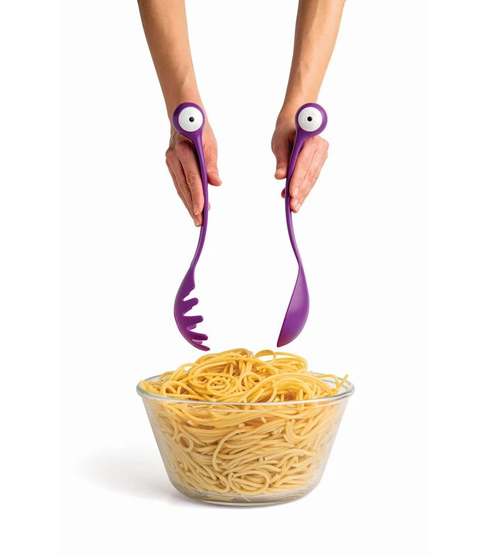 Rond etenstijd verschijnt langzaam het pasta monster van Ototo uit je keukenlade om je te helpen bij het avondeten! Met behulp van deze kleine monsters lepel je met gemak glibberige spaghetti of tagliatelle slierten op je bord. De set bestaat uit één spaghetti lepel met gat en een ronde opscheplepel. Daarnaast kun je deze leuke lepels ook gebruiken om salade mee op te scheppen.
