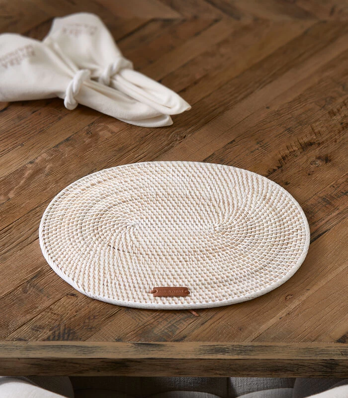 Ga voor een fris gedekte tafel met deze placemat uit de Crystal Bay–serie. De placemat is ovaal van vorm waarvan de banen in een spiraal lopen. De strengen zijn gemaakt van pitriet, dit is de kern van een rattanstengel en heeft daardoor een lichtere bruine/naturel kleur. Het placemat is afgewerkt met witte banen en een lederen label.