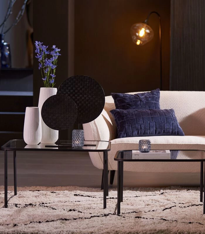 Ben jij op zoek naar een bijzettafel voor in jouw moderne interieur? Dan is bijzettafel Lofti echt wat voor jou. Deze set bestaat uit twee tafels met een glazen tafelblad en een zwart metalen onderstel. Door de vierkante vorm van de bijzettafels heeft deze een moderne uitstraling. Zet deze tafels in de woonkamer en zorg zo voor een plek waar je lekker een kopje thee of koffie op kan zetten wanneer je tv kijkt. Wij adviseren wel om altijd een onderzetter te gebruiken, zo gaat de tafel een stuk langer mee. De afmeting van de grootste tafel is 75 x 75 x 44 centimeter en de afmeting van de kleinste tafel is 65 x 65 x 40 centimeter.