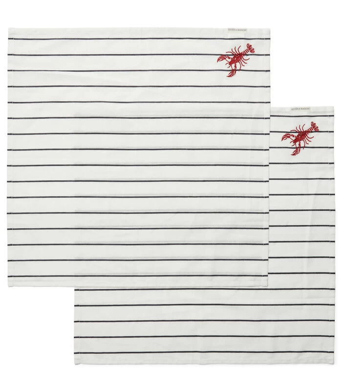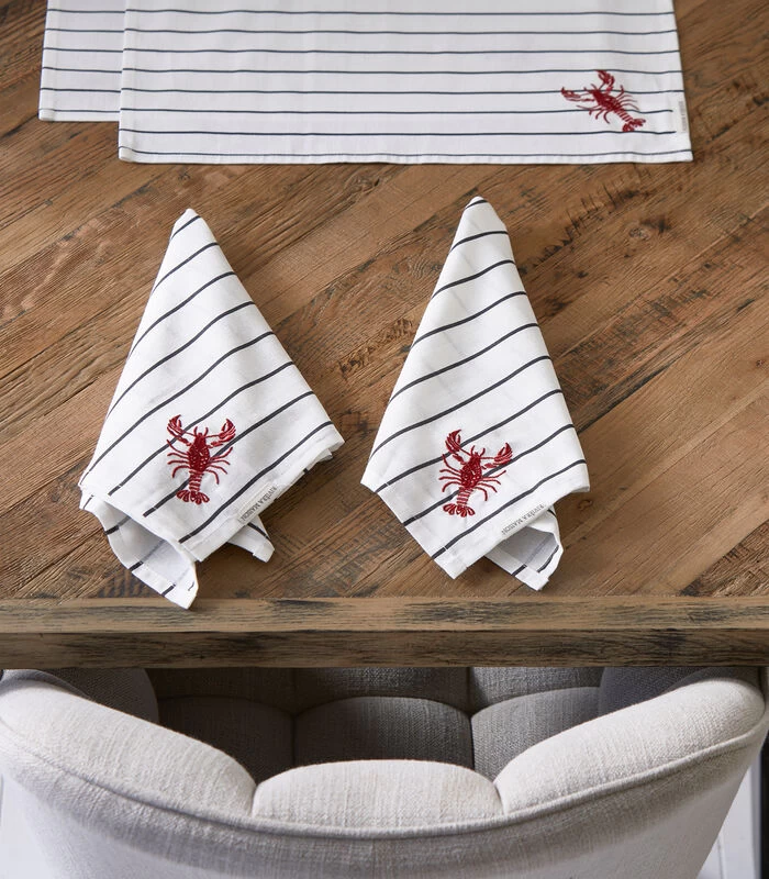 Met de RM Classic Lobster servetten haal je een set van twee stoffen servetten in huis. Beide met een vrolijke decoratie met donkerblauwe strepen en een geborduurde kreeft.