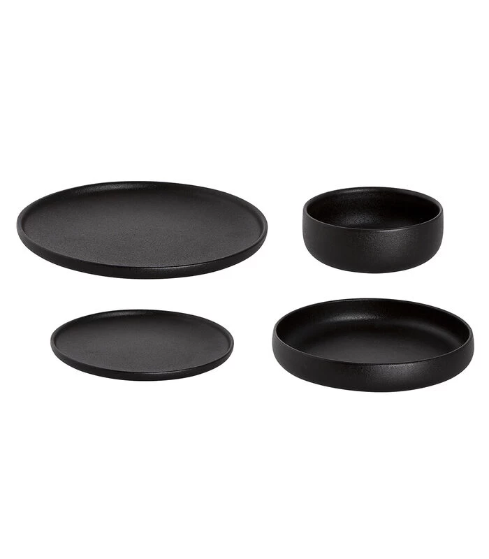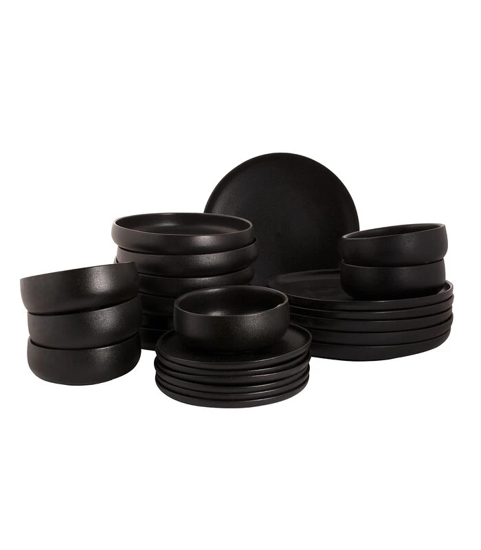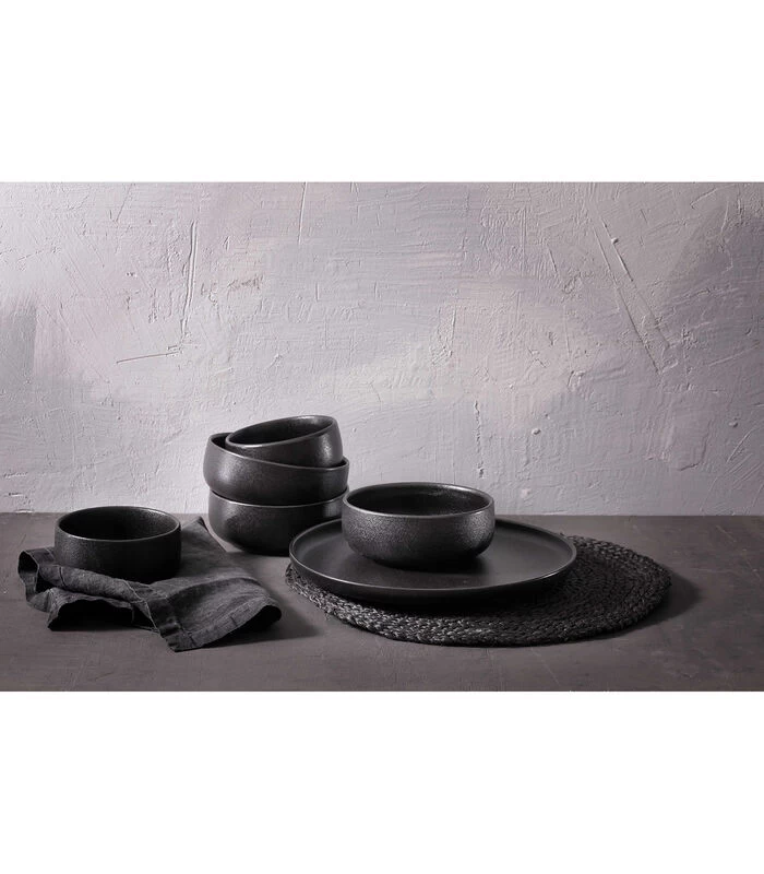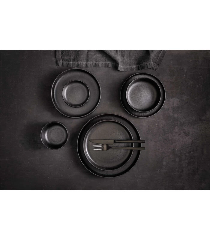 Een stijlvolle tafelsetting krijg je met deze porseleinen serie met mat zwarte kleur en ruwe afwerking. De ronde vormen en hoge rand zorgen voor een speelse twist. Deze serie is goed te combineren met de serie Cosmic. Deze prachtige zwarte 24–delige serviesset bestaat uit 6 dinerborden met een diameter van 26 cm, 6 ontbijtborden van 19 cm, 6 diepe borden van 21 cm en 6 schalen met een doorsnede van 14 cm en een inhoudsmaat van 65 cl. Na gebruik kan de volledige set gereinigd worden in de vaatwasmachine.