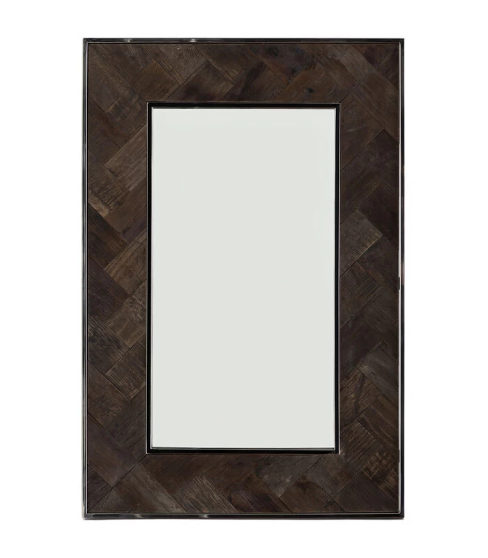 Niet alleen voor vloeren is het visgraatmotief erg populair, ook in accessoires zie je dit klassieke patroon terug, zoals bij spiegel Bushwick. Deze rechthoekige spiegel heeft namelijk een rand van oud iepenhout dat in visgraatpatroon is gelegd. De buitenste en binnenste rand zijn van glanzend roestvrij staal.