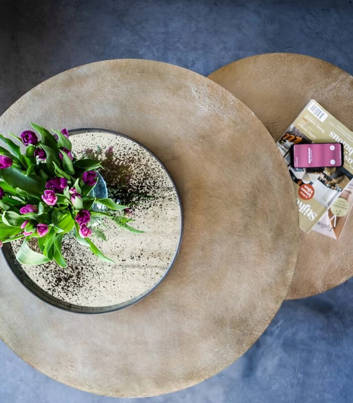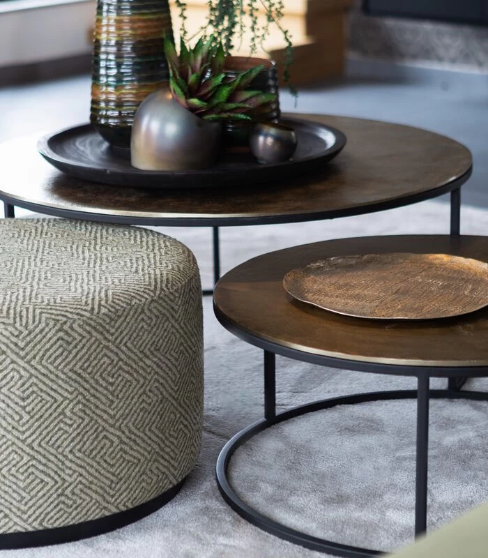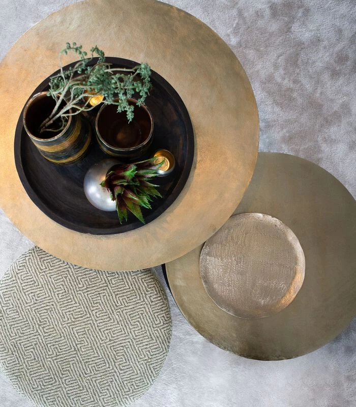 Iedereen is op zoek naar schoonheid. Dat vind je bij de salontafeltjes Tarifa. Het zwart metalen onderstel van de ronde bijzettafeltjes is zo ontwerpen dat ze perfect in elkaar schuiven. Het blad in ruw antique brass heeft een natuurlijke uitstraling alsof het van natuursteen gemaakt is. Het geheel straalt een sfeer van ingetogen luxe uit. Prachtig. Maar niet over the top. Deze salontafeltjes kan je integreren in elke woonstijl.