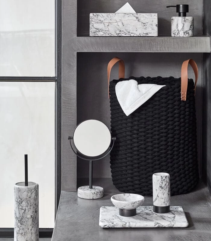 Natuurlijk en stijlvol; de Nero serie van Aquanova bestaat uit handgemaakte badkameraccessoires van natuursteen. De combinatie grijstinten en zwarte kenmerken maakt deze serie uniek! Tip: mooi te combineren bij een betonlook muur of vloer.
