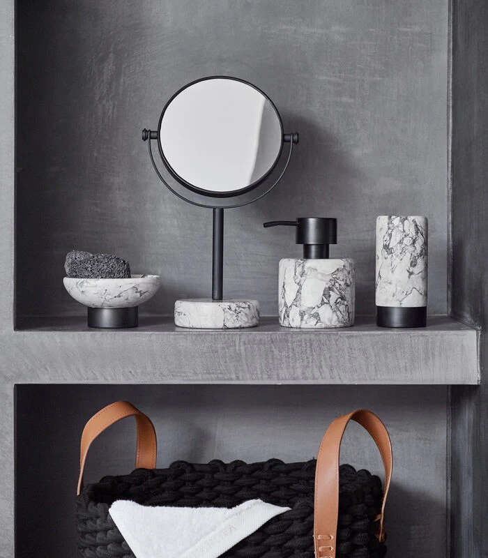 Natuurlijk en stijlvol; de Nero serie van Aquanova bestaat uit handgemaakte badkameraccessoires van natuursteen. De combinatie grijstinten en zwarte kenmerken maakt deze serie uniek! Tip: mooi te combineren bij een betonlook muur of vloer.