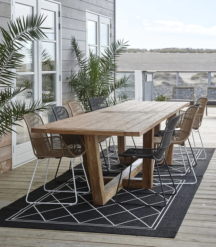 Eindeloos tafelen met zijn allen tijdens mooie zomeravonden, daar is ruimte genoeg voor aan deze tafel. Het blad is van stevig teakhout, de poten ook. Die rusten op één lange balk onder met daarop aansluitend de zijpoten. Daardoor is de tafel erg stevig. Deze eettafel is er in twee maten.