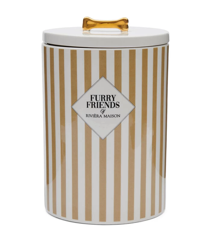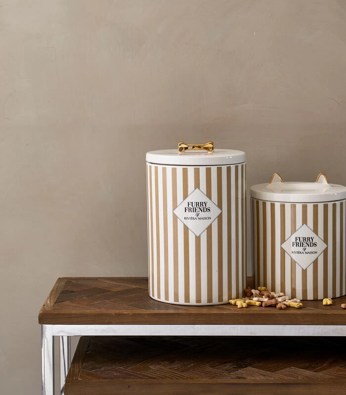 Bewaar de hondensnoepjes of brokjes van jouw lieve hond in deze handige voorraadpot. De gestreepte voorraadpot heeft een gouden hondenbrokje als leuk detail op de deksel. Deze voorraadpot is leuk te combineren met de voederbakken voor de hond.