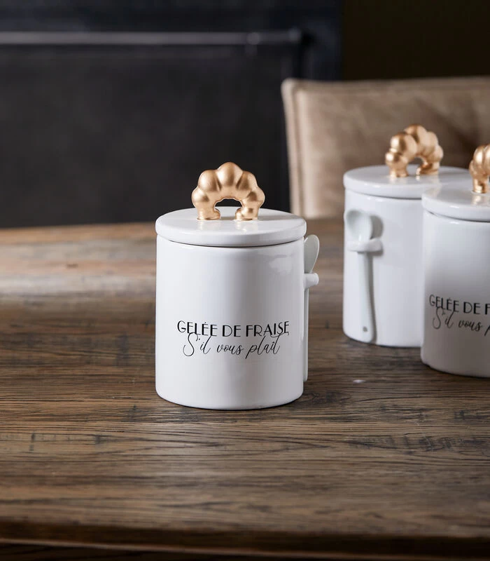 Wil je eens iets anders dan een glazen jampot op tafel? Bewaar je confituren dan in deze porseleinen voorraadpot. De siliconen ring zorgt ervoor dat het deksel de pot goed afsluit en dat alles wat je erin bewaart, langer vers blijft. De greep van het deksel is een gouden croissantje, waaraan je het deksel eenvoudig optilt.