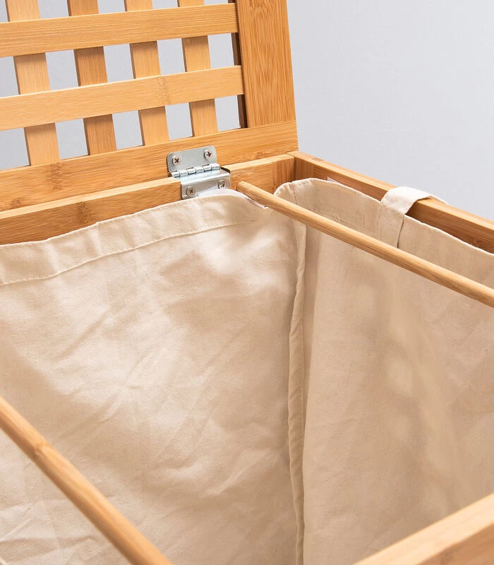De bamboe wasmand, met zijn wasbare binnenvoering, is zeer praktisch. Het elegante uiterlijk maakt hem geschikt voor gebruik in de slaapkamer of kinderkamer.