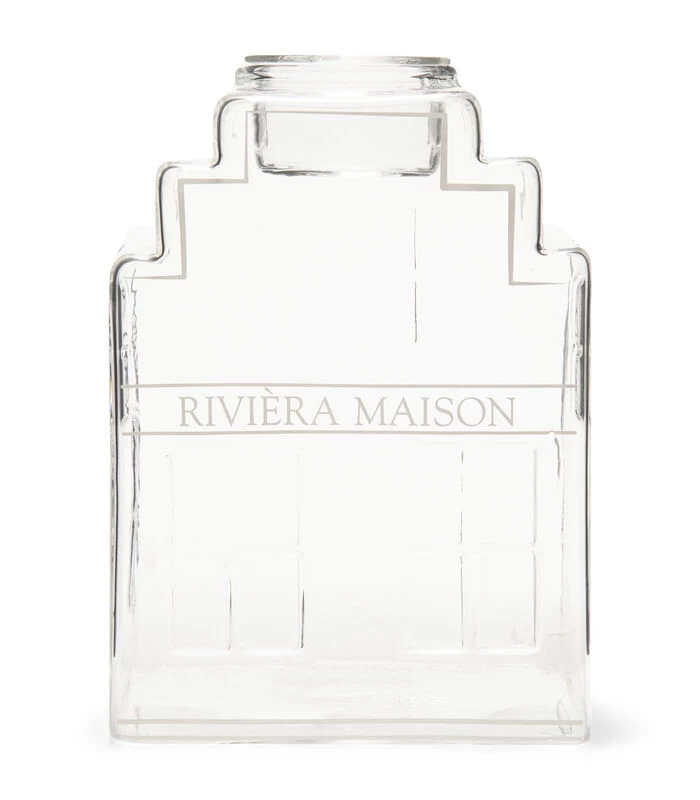Dit grachtenpand van glas heeft op zijn dak een vorm voor een waxinelichtje. Maar dat vormpje kan ook worden losgemaakt, zodat je in het grachtenpand decoraties en kleine versiersels kunt doen, om het geheel een feestelijk aanzien te geven. De RM–branding mag hier natuurlijk niet ontbreken.