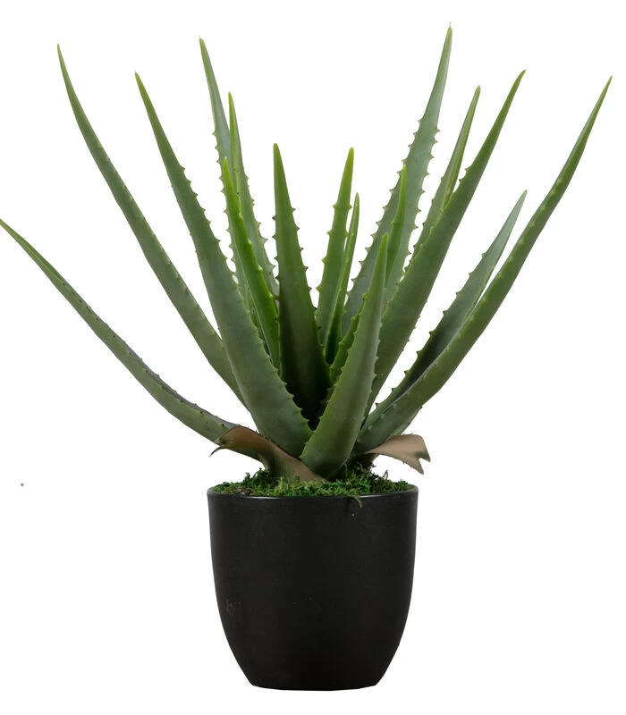 Deze Aloë Vera in pot is 46 cm hoog en, wanneer volledig in model gebracht zoals te zien is op de productfotografie, 30 cm in het rond. De zwarte kunststoffen pot heeft een diameter van 14 cm. De plant weegt per stuk 2 kg.