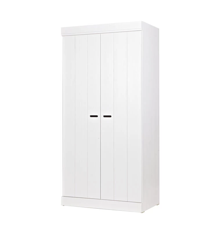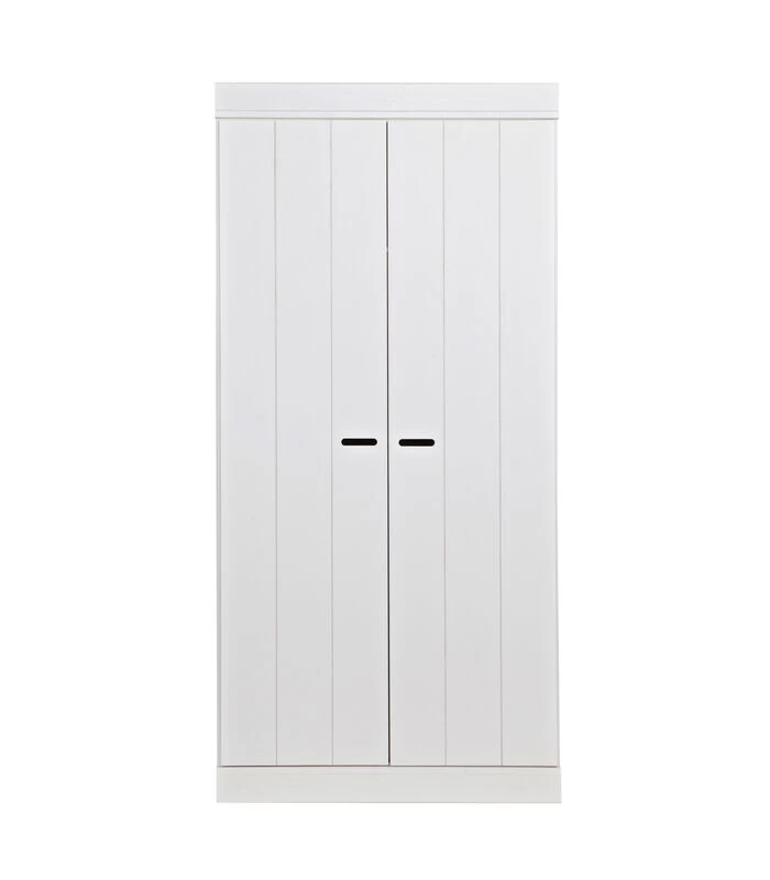 Uit de serie CONNECT: een stoere basic kast met strakke sokkel en koof gecombineerd met strokendeuren met sleuven. Met de CONNECT kasten kun je je eigen kastenwand bouwen! In de hal, slaap– of kinderkamer: CONNECT past in iedere ruimte! Als losse kast of als meerdere kasten aan elkaar gekoppeld. De romp van de CONNECT kast is gemaakt van massief grenenhout. De binnenzijde is voorzien van een spaanplaat/melamine interieur, erg praktisch met schoonmaken. De kasten zijn in de kleur wit gespoten, maar je schildert ze binnen een handomdraai ook in een andere kleur. De serie CONNECT bestaat uit een ladekast en 3 basiskasten: Een 2–drs kast, een 2–drs kast met lades en een 3–drs kast met lades. De kasten zijn zo gemaakt dat ze vlak tegen elkaar aan kunnen worden geplaatst. De kasten kunnen perfect naast elkaar geplaatst worden en zo kun je de kast zo breed maken als je zelf wilt. Wij adviseren de ladekast tussen twee kasten te plaatsen en dat er niet met deze kast wordt geëindigd (zoals afgebeeld). Dit omdat de ladekast minder diep is dan de andere kasten. De 2–drs en 3–drs kasten zijn beschikbaar met twee typen deuren: een strokendeur met sleuven als handgreep of de stoere lockerdeur met wit metalen grepen. De CONNECT kasten zijn verkrijgbaar met het standaard hang–/leg interieur (1 roede + 1 legplank) of met een aanvullend interieur, bevattende een tussenschot en 3 gedeelde legplanken. De kasten CONNECT worden geleverd als eenvoudig bouwpakket met een duidelijke montage–instructie.